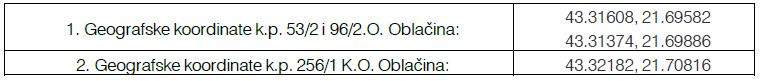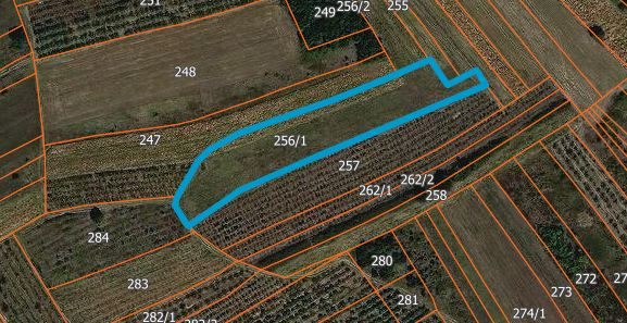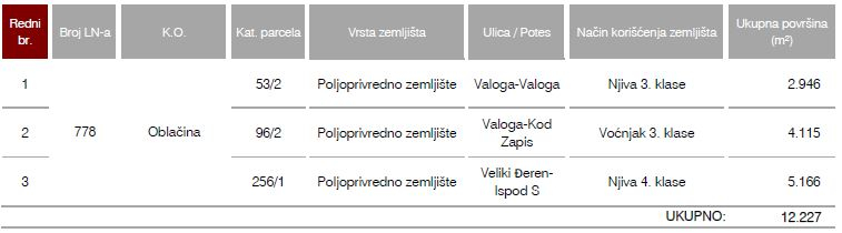 Sale of agricultural land on cadastral parcels no. 53/2 (field of 3rd class), 96/2 (orchard of 3rd class and 256/1 (field of 4th class), C.M. Oblačina, total area 1 ha 22 a 27 m2, which is registered in the real estate register No. 778, it is located in the atar of the settlement Oblačina in the municipality of Merošina