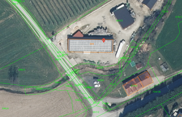 The subject of sale is located in cadastral municipality 227 – Terbegovci, parcel no. 569/3 with a total area of 9,174 m². The property comprises an intensive orchard with a water reservoir, a production and storage facility building no. 344 with a net floor area of 359 m², and two auxiliary buildings.