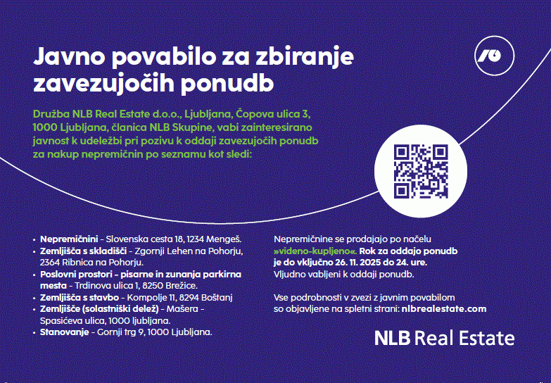 - Družba NLB Real Estate d.o.o., Ljubljana, Čopova ulica 3, 1000 Ljubljana, članica NLB Skupine, vabi zainteresirano javnost k udeležbi pri pozivu k oddaji zavezujočih ponudb za nakup nepremičnin po seznamu kot sledi: